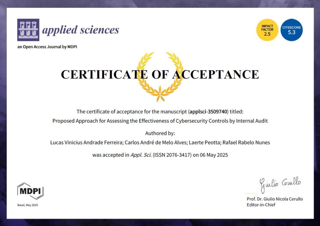 Após uma longa jornada de pesquisa e revisões, temos a alegria de anunciar a publicação do artigo “Proposed Approach for Assessing the Effectiveness of Cybersecurity Controls by Internal Audit”, na revista Applied Sciences (MDPI) – uma publicação internacional com fator de impacto 2.5.